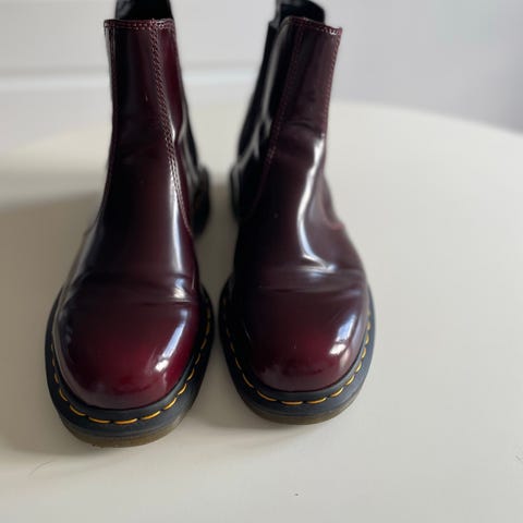 Dr. Martens 1460 støvler i bordeaux rød farve. Fremstillet i læder med sort snørebånd og den karakteristiske gule syning langs sålen. Støvlerne har en slidstærk gummisål med mønster for godt greb. Str. 40 (EU). Designet til både holdbarhed og komfort.