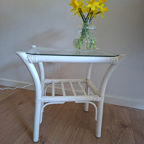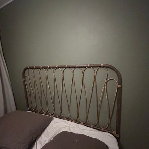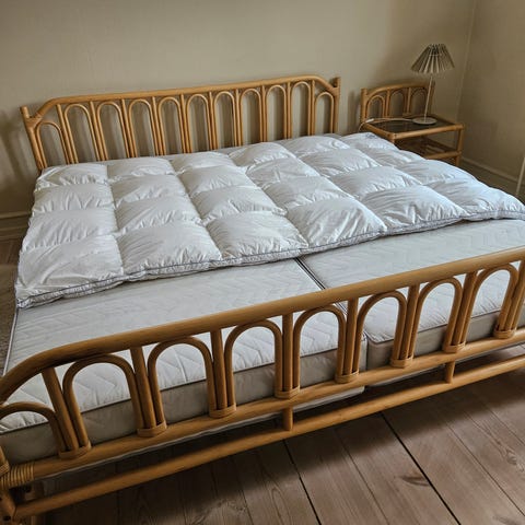 Her er en fed retro bambusseng - eller gavle af kraftig bambus og flet - sengesiderne er af træ. Der er ingen bund men kan tilkøbes diverse boligbutikker. Så det er et lille gør det selv projekt, men kn blive til en så fin sommerhusseng eller lign. Den ene ende af den ene træ-side har slået sig en lille bitte smule og har lidt mikroflos for enden men ellers er det hele fint og intakt og nemt at samle.