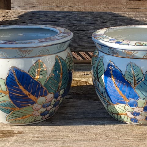 Flot krukke med smuk motiv af fugle og blomster i blå, grønne og brune nuancer.