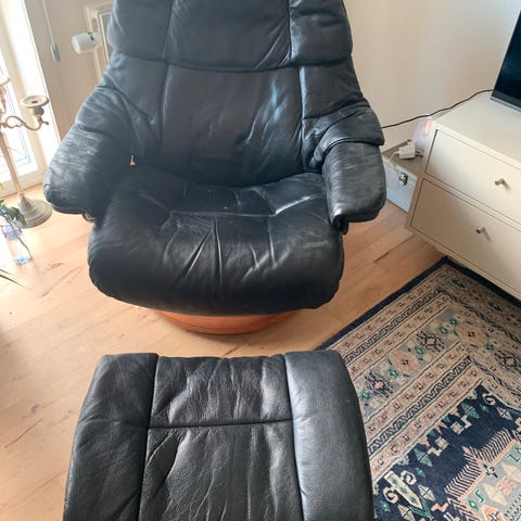 Pæn og velholdt stol med fodskammel , sort læder med sortbejset stel , str. S.