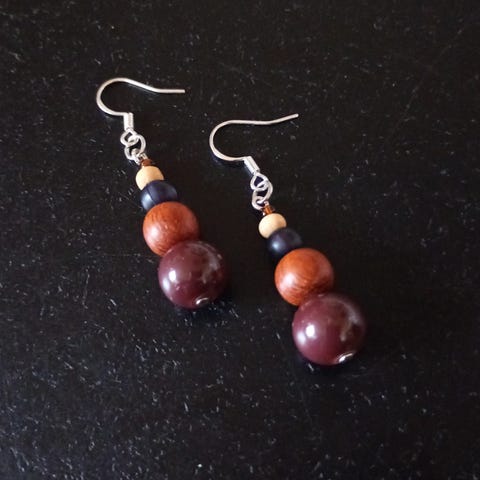 Håndlavet kugle øreringe med perler af dekoreret opalglas, howlite og snowflake obsidian samt sorte og kobberfarvede perler. øreringekroge af sterling sølv.