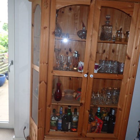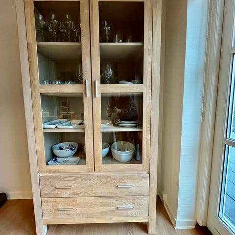 Flot vitrineskab i lakeret bøg med fine glashylder og 4 skuffer forneden. Flot design a Gunnar Falsig- god kvalitet. Meget meget pæn stand! Gunnar Falsig fra Ilva, nypris 3500,-