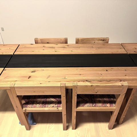 Træ spisebord i massivt bøg med fire tilhørende stole. Bordet har en naturlig træfinish. Velegnet til spisestue eller køkkenområde.
