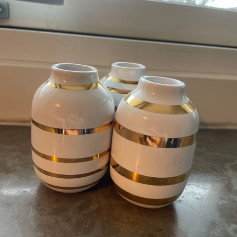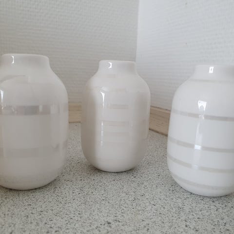 Tre rigtig fine minivaser, hvor den lille er 5,8 cm høj, den mellemste 6,4 cm og den store 8,2 cm, er fra Kählers berømte serie Hammershøi. De er fremstillet i glaseret porcelæn, har selvfølgelig de klassiske riller, og er designet af Hans-Christian Bauer