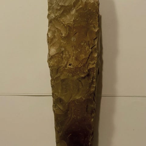 Dansk oldsag. Fladehugget segl i flint. Dolktid/Ældre bronzealder: Anno 2350-1000 F.Kr. Litteratur: FLINT af Peter Vang Petersen. Side 138-139. Fundsted: Danmark. Mål: 12,5x3,5 cm.