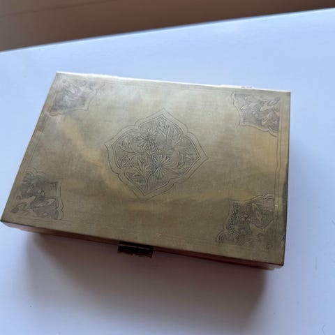 Ægte ildfast bronze med buet låg rødt træ indvendig, bredde 21 cm, dyb 15 cm, høj 6 cm.