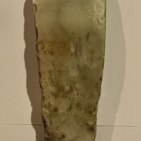 Dansk oldsag. Tyndnakket firsidet flintøkse. Type IIIb. Tragtbægerkultur. Yngre Stenalder: Anno 4000-2800 F.Kr. Litteratur: FLINT af Peter Vang Petersen. Side 107. Proveniens: fundet på Kjellerupgaard, Kjellerup 8620, Danmark. Øksen er fundet af daværende ejer af gården, arvet af sønnen og solgt til os, så første gang i handlen. Mål: 15x7x3 cm.