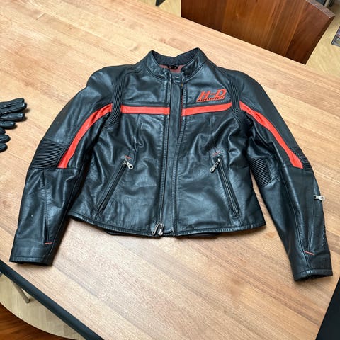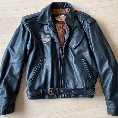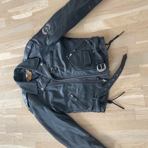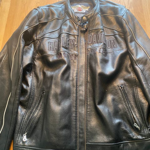 Harley-Davidson Andre jakker i størrelse XL til kvinder. Jakken er sort og lavet af lædermateriale. Den har lynlåslommer foran og broderede detaljer på ryggen og ærmerne. Jakken har en quiltet indvendig foring i blå farve, hvilket giver ekstra komfort og varme.