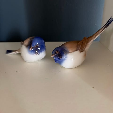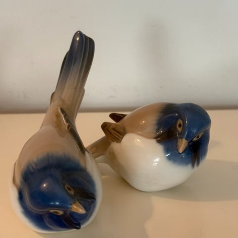Figurerne på billedet er kendt som "Optimist og Pessimist" og er designet af Jens Peter Dahl Jensen for Bing & Grøndahl. De forestiller to mejser, hvor den ene kigger opad (optimisten, figur nr. 1633) og den anden kigger nedad (pessimisten, figur nr. 1635). Figurerne er udført i porcelæn Bing & Grøndahl fuglefigur i porcelæn med blå og hvide farver. Figuren er detaljeret med en glaseret finish og viser en siddende fugl med blå hoved, hvide bryst og brune vinger.