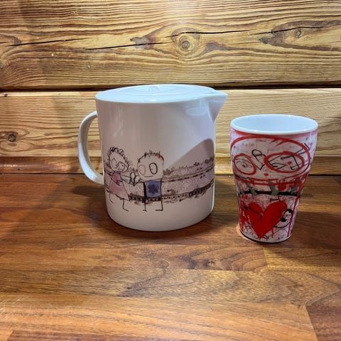 Designet bærer Poul Pavas karakteristiske naive og farverige streg med figurer og detaljer, der symboliserer glæde og fællesskab.