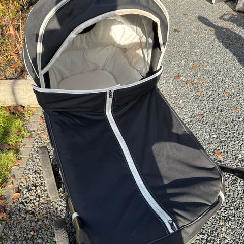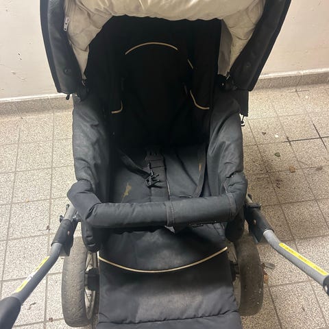 Emmaljunga barnevogn i blå og sort farve med robust stel og store hjul. Barnevognen har justerbar rygstøtte, polstret sæde og sikkerhedssele. Designet til komfort og funktionalitet ved børnepasning og udendørs brug.