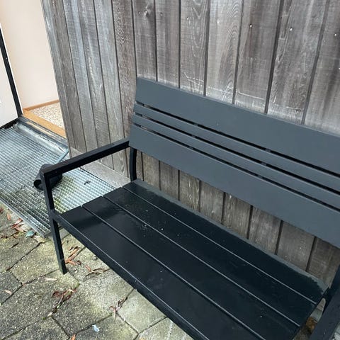 Sort metal bænk med polstret gråt sæde og opbevaringshylder