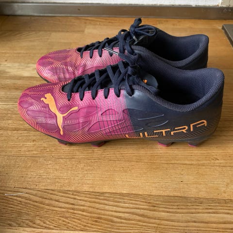 Puma Ultra fodboldstøvler i pink farve, størrelse 31 (EU). Støvlerne har snørelukning og er designet til børn. Materialet er syntetisk med et design, der sikrer god pasform og støtte under spil.