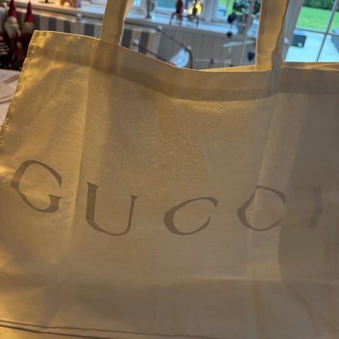 Stof Taske til kvinder i beige og brun farve. Tasken har to ydre lommer med klap og spænder, samt brune håndtag. Materialet er stof med det klassiske Gucci mønster.