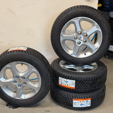 Nokian, 6-7 mm mønster, fælge med dæk, 4 stk. Nokian WR Snowproof vinterhjul. DOT 2322. Både M+S og snefnugsymbol. Passer til Volvo V40, V40 Cross Country, V50, V60, V60 Cross Country, S60 mfl., og flere Ford modeller bl.a. C-MAX, Focus, Mondeo.