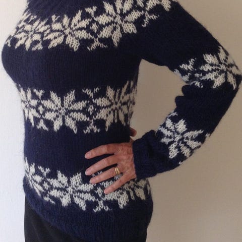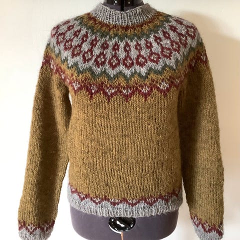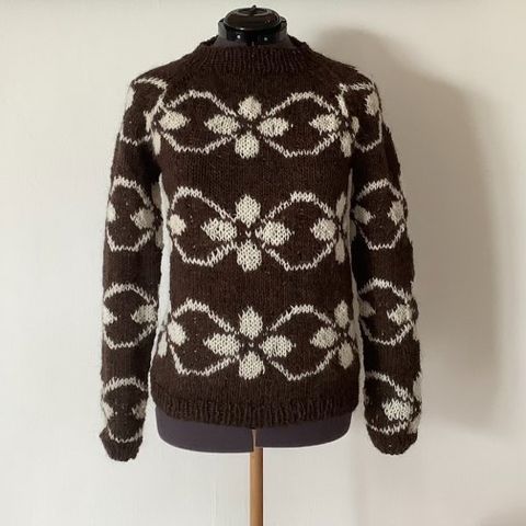 Sweater i helt nyt design fra FruStrik. Håndstrikket i ren islandsk uld. Bundfarven er mørk grå og der er firkanter i bordeaux, pink, lys blå og sennepsgul.