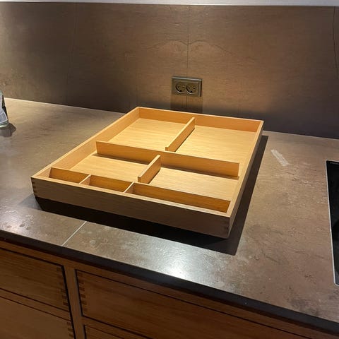 Snedker bestikindsats i olieret egetræ 72x48 cm. Højde 52 mm.