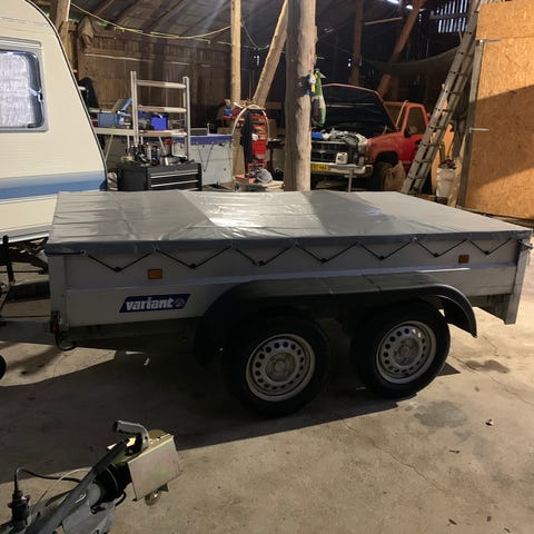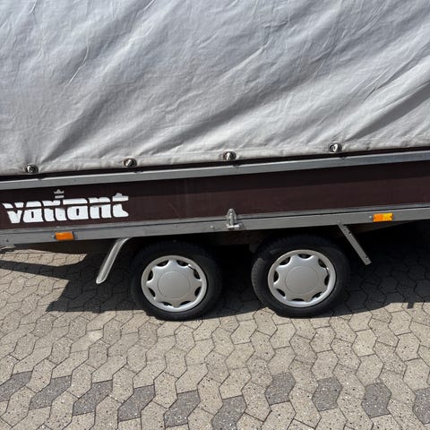 Har denne trailer til salg Variant 3021 P4, den er fra 2015, har en total vægt på 3000 kg og må laste 2475 kg, indvendig mål 315x205 cm, der er monteret baklygter og blitsblink som tænder når der kommer lys i baklygterne