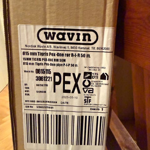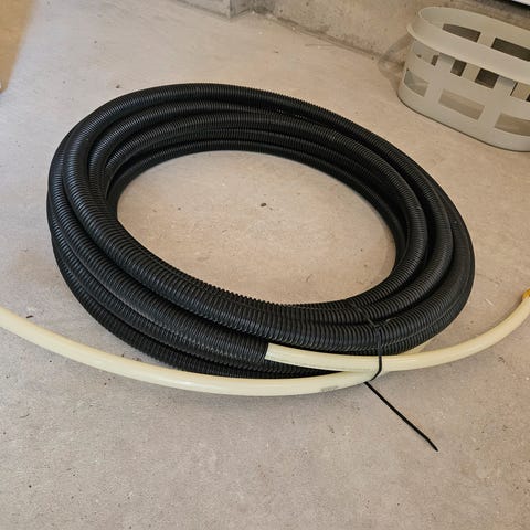 1 rulle med ubrugt PEX rør i rør med ilt barriere. 15mm x 3mm. 1 styk med 24 meters længde.