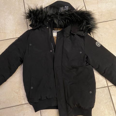 Horze Equestrian 82 børnejakke i størrelse 134/140 cm (9-10 år). Jakken er sort med hvide striber på ærmerne og har hætte. Materialet er designet til ridning og udendørs brug.