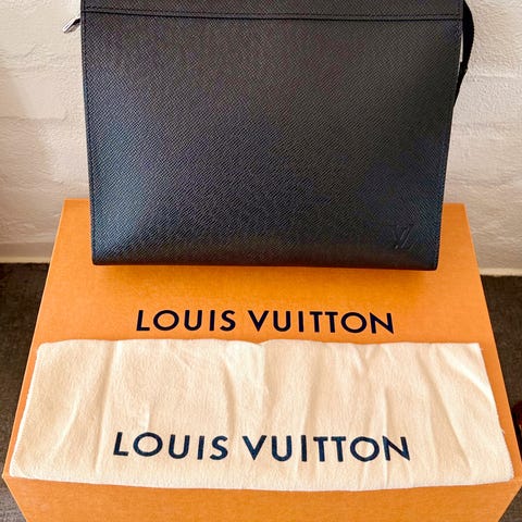 Elegant Louis Vuitton Pochette Voyage i monogram Eclipse canvas med sølvfarvet hardware. En stilren og funktionel clutch - perfekt til at opbevare dokumenter, iPad eller daglige essentials. Det minimalistiske design kombinerer Louis Vuittons klassiske håndværk med et moderne, sofistikeret udtryk.