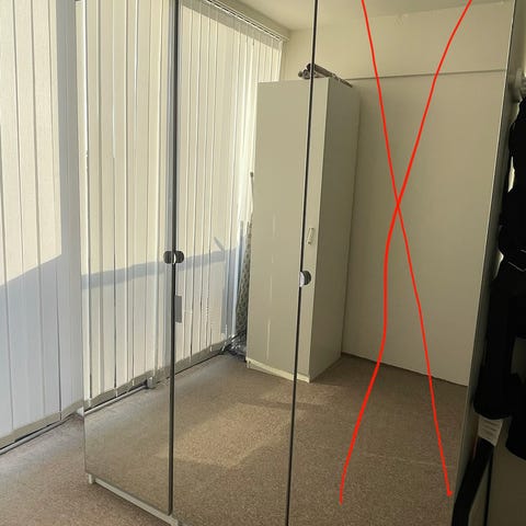 1x spejl skabslåge ÅHEIM 25x195cm og 1x beige skabslåge FLISBERGET 50x195cm. Passer til at IKEA pax skab på 75cm. Hængsler medfølger.