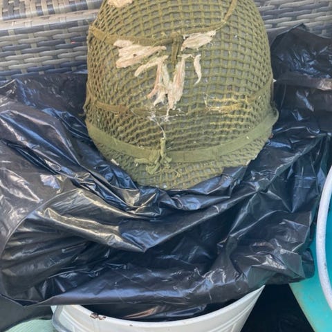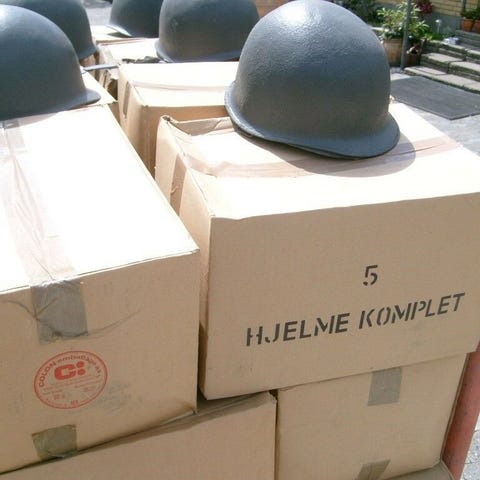 Militær hjelm med netcover i grøn farve. Hjelmen har justerbare stropper og indvendigt polstret for komfort og beskyttelse. Designet til beskyttelse af hovedet under militære aktiviteter.