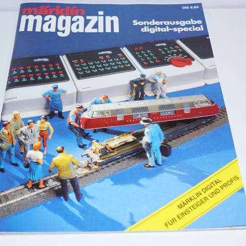 Märklin Magazin modeltog. Magasinerne indeholder artikler og information om modeltog, herunder detaljer om damplokomotiver og landskabsskabelse i H0-skala. Udgaverne varierer i årstal og temaer, hvilket gør dem relevante for modeltogentusiaster og samlere.