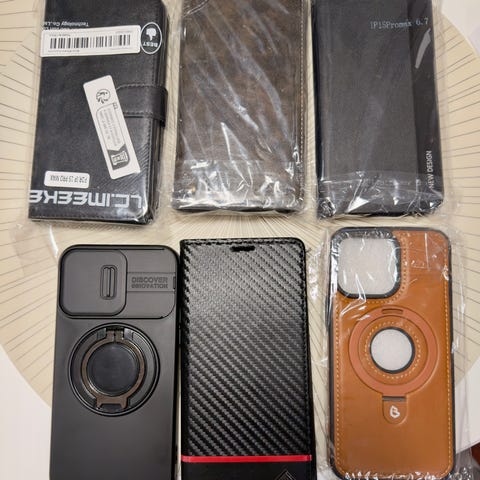 2-1 case til iPhone 15 Pro Max i læder med plads til tre kort, Virker med Magsafe, Case sidder fast med magnet på omslaget så det nemt kan tages af og på. Er helt nyt og ubrugt.