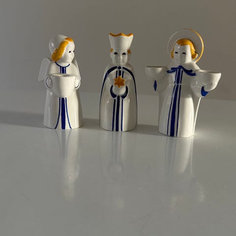 Ingen skader - en anelse gennemsigtige krakeleringer på rød prins og blå engel - ingen på guld-prins. En anelse stearin-spor i lyshuller. Alle er virkelig flotte.
