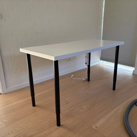 Hvidt skrivebord med hjul og inkluderet stikdåse. Bordpladen måler 120 x 60 cm og er let at flytte rundt på grund af hjulene. Ideel til kontor eller hjemmebrug.
