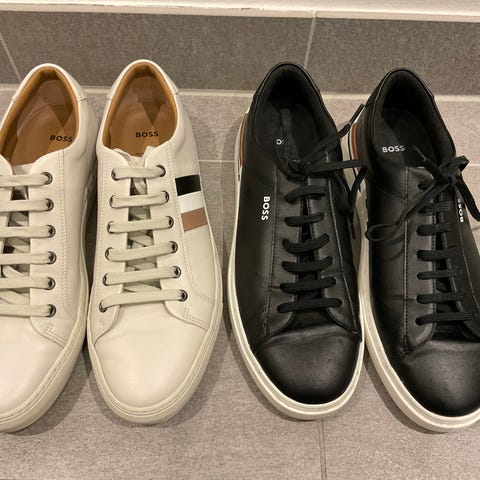 Det ene par er et par Bugatti sko og det andet par er et par Waldläufer de har kostet omkring 800 til 1000 kr. Per par sælges for 300 kr. stykket.