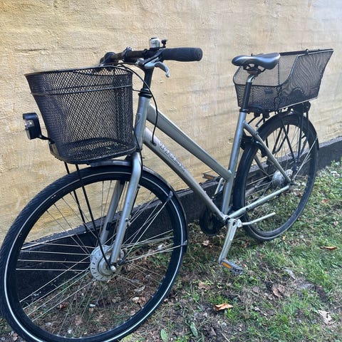 Trek Andre bycykel i hvid og sort med stel tilpasset voksne. Cyklen har en stor bagkurv til opbevaring, skivebremser foran og bagpå, samt justerbart styr og sadel for komfortabel kørsel. Egnet til bykørsel og daglig transport.Checken er til stede