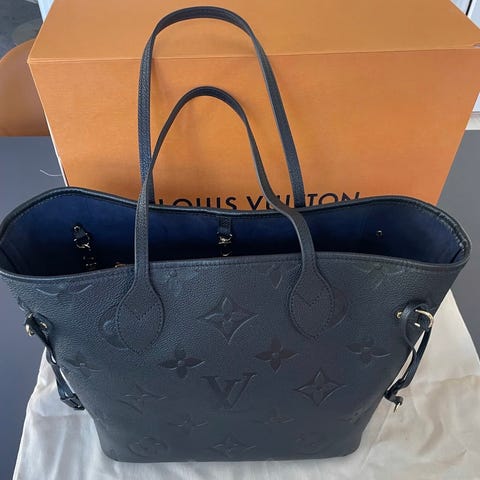 Louis Vuitton Neverfull MM Tote Bag i sort læder til kvinder. Tasken har et rummeligt indre med en aftagelig lynlåspose, der kan bruges separat. Designet inkluderer de karakteristiske LV-monogrammer præget i læderet. Tasken har to skulderremme og justerbare sider for fleksibel opbevaringsplads.