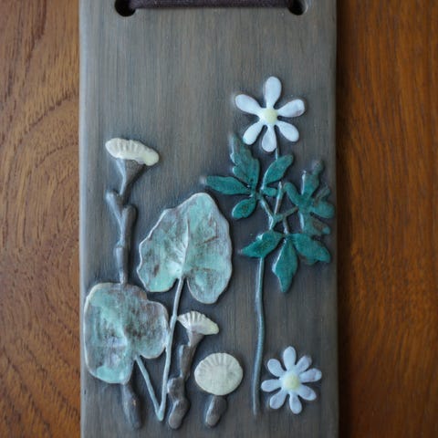 Fin keramisk relief / vægplade / vægdekoration med motiv af sommerfugle og blomster. Brun uglaseret baggrund. Ukendt oprindelse og alder.