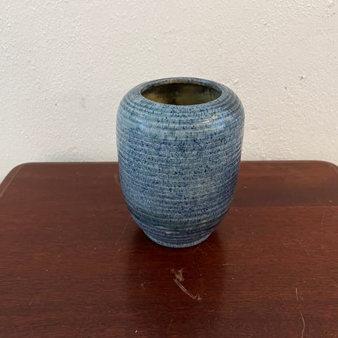 Arabia Ruija vase i blå keramik med floral mønster. Vasen har en firkantet form og er dekoreret med blå blomster på en lys baggrund. Den er designet til at kunne bruges som dekorativ genstand eller til opbevaring af blomster.