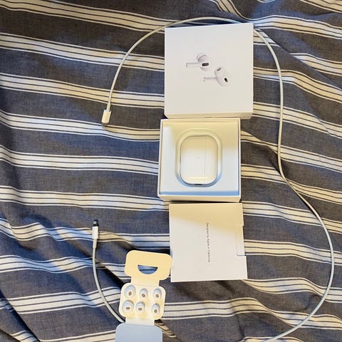 Apple AirPods Pro trådløse in-ear hovedtelefoner i hvid. Kommer med opladningsetui. Designet til at give aktiv støjreduktion og tilpasset pasform med silikoneørestykker. Velegnet til brug med Apple-enheder og andre Bluetooth-kompatible enheder.
