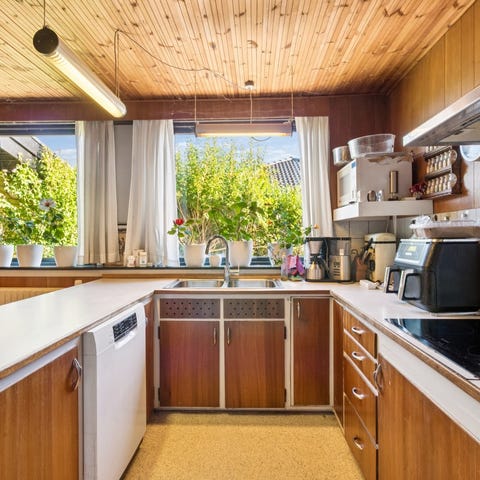 Teaktræslåger og skuffer fra dette 1965-køkken sælges.
