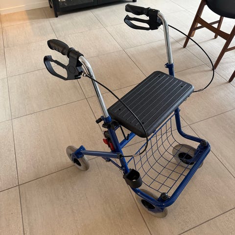 Jazz rollator med fire hjul, sort farve, udstyret med kurv og sæde. Samt næsten lige påsat et rygstøtte til 600kr , Velegnet til indendørs og udendørs brug til personer, der har brug for støtte ved gang. Nemt at klappe sammen for at medbringe i bilen
