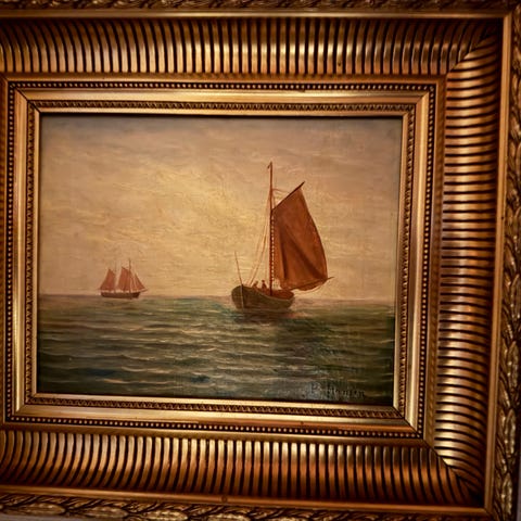 Maleri med motiv af sejlskib og by ved vandet i varme farver. Maleriet er indrammet i en enkel træramme og har en signatur i nederste venstre hjørne. Bagsiden viser ophængningssnor til vægophængning.