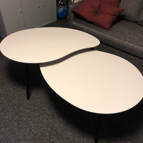 Flot sofabord i sæbebehandlet eg med bordplade i sort linolium