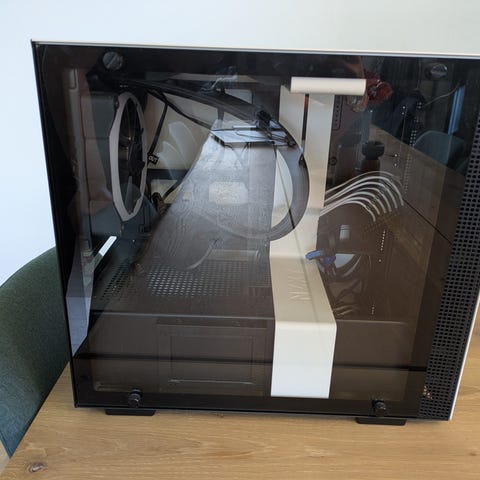 NZXT H510 PC-kabinet med sideglaspanel. Kabinettet er sort med blå detaljer og har et moderne design. Velegnet til opbygning af stationær computer med mulighed for god intern ventilation og kabelstyring.