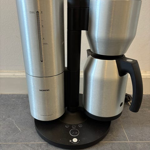 Fri fragt i hele DK, Siemens Design by Porsche kaffemaskine i rustfrit stål med integreret vandbeholder og filter. Maskinen har kapacitet til 2-8 kopper kaffe og betjenes med enkle knapper til on/off og kopantal. Designet kombinerer funktionalitet med et moderne udseende.
