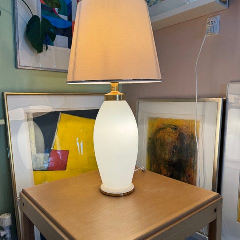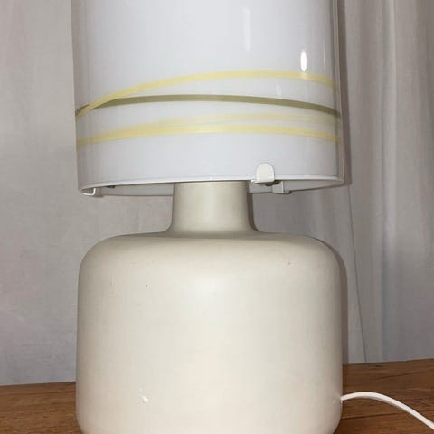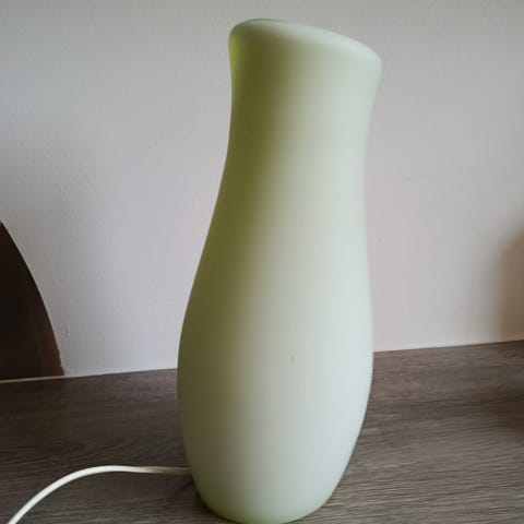 Smuk minimalistisk vintage stemningslampe. Ikea håndlavet glasbordlampe, natlampe. Lampen er lavet af glas, det indvendige lag er blåt og det ydre er hvidt. Et meget flot design på grund af den let buede form. Denne lampe er en hyggelig blå natlampe og et blikfang i dit hjem. Mål: H: 30,5 cm. Ø: Bund:10 cm. Midten: 14 cm. Top: 9 cm. Hvid lampeledning - 2,45 m. med afbryder. Type 0443. Designere: K. Leibel og K. Andreasson. Brugt pæn vintage stand med minimale brugsspor. Fra ryge-og dyrefrit hjem. Gode P forhold ved afhentning på adressen.