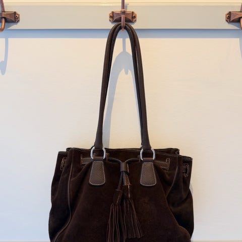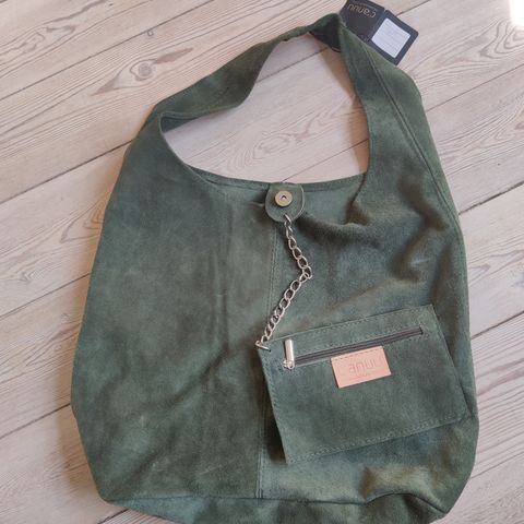Blød ruskinds skuldertaske med broderede blomster og plys foer.