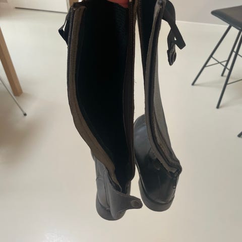 Uidentificeret mærke læder ridestøvler i sort farve. Leggins har lynlås på siden og knaplukning ved anklen. Designet til at dække underbenet, egnet til ridning eller lignende aktiviteter.
