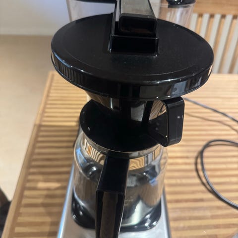 Smeg kaffemaskine i beige farve med retrodesign. Maskinen har en glaskande med håndtag og et simpelt kontrolpanel med knapper til betjening. Den er egnet til brygning af kaffe til flere kopper ad gangen. Produktet leveres i original emballage.