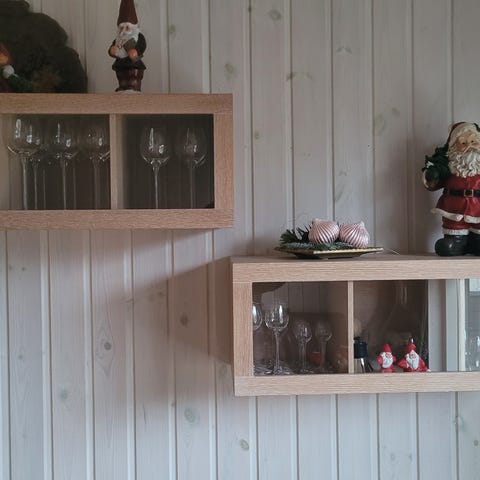 Skabet har to glasplader i den øverste del til opbevaring eller fremvisning. Nederst er der en hylde bag lågerne. Skuffen har en grøn filtbeklædning i bunden. Velegnet til opbevaring og udstilling af diverse genstande.