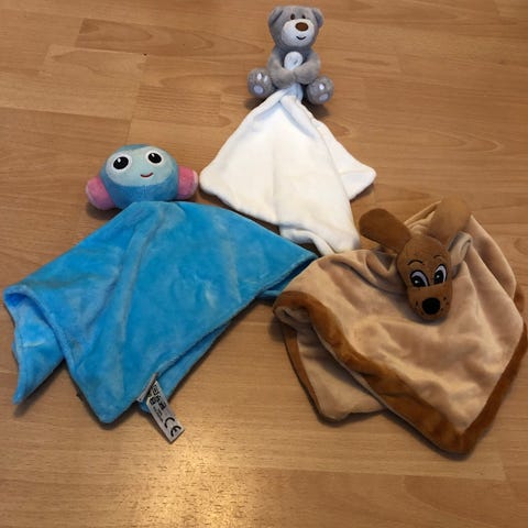 Skofus sutteklud nusseklud hund børnetæppe i grå farve med tilhørende pude formet som en hund. Tæppet er lavet af blødt materiale, egnet til børn. Tæppet og puden kan bruges til hygge og leg.