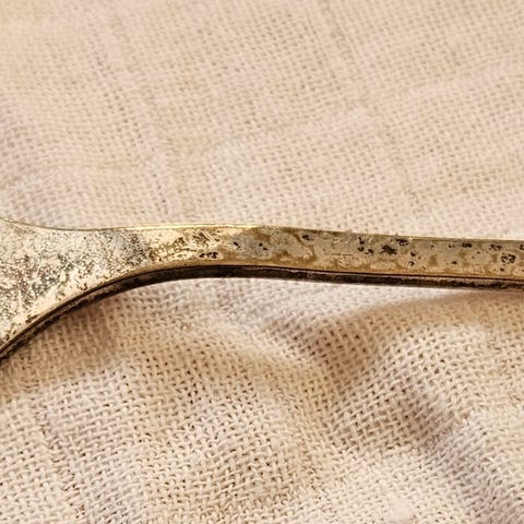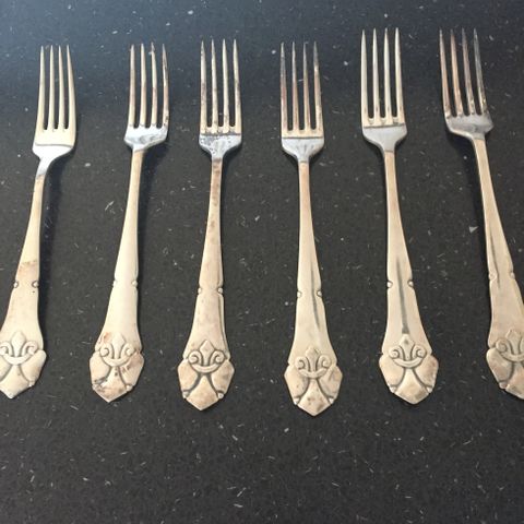 Gaffel sæt bestående af fire usædvanlige gamle gafler af ukendt mærke muligvis udenlandske. De ligner de danske mærker Hindsgavl og Riberhus, men er lidt anderledes i ornamentikken og gaflerne er ret store. De er fremstillet i pletsølv og har et dekorativt mønster på skaftet. Fine på et nostalgisk middagsbord, i en café eller evt. til smykkefremstilling. De kan sendes - det koster 45 kr i forsendelse - eller hentes på Frederiksberg. Jeg tager mobilepay.